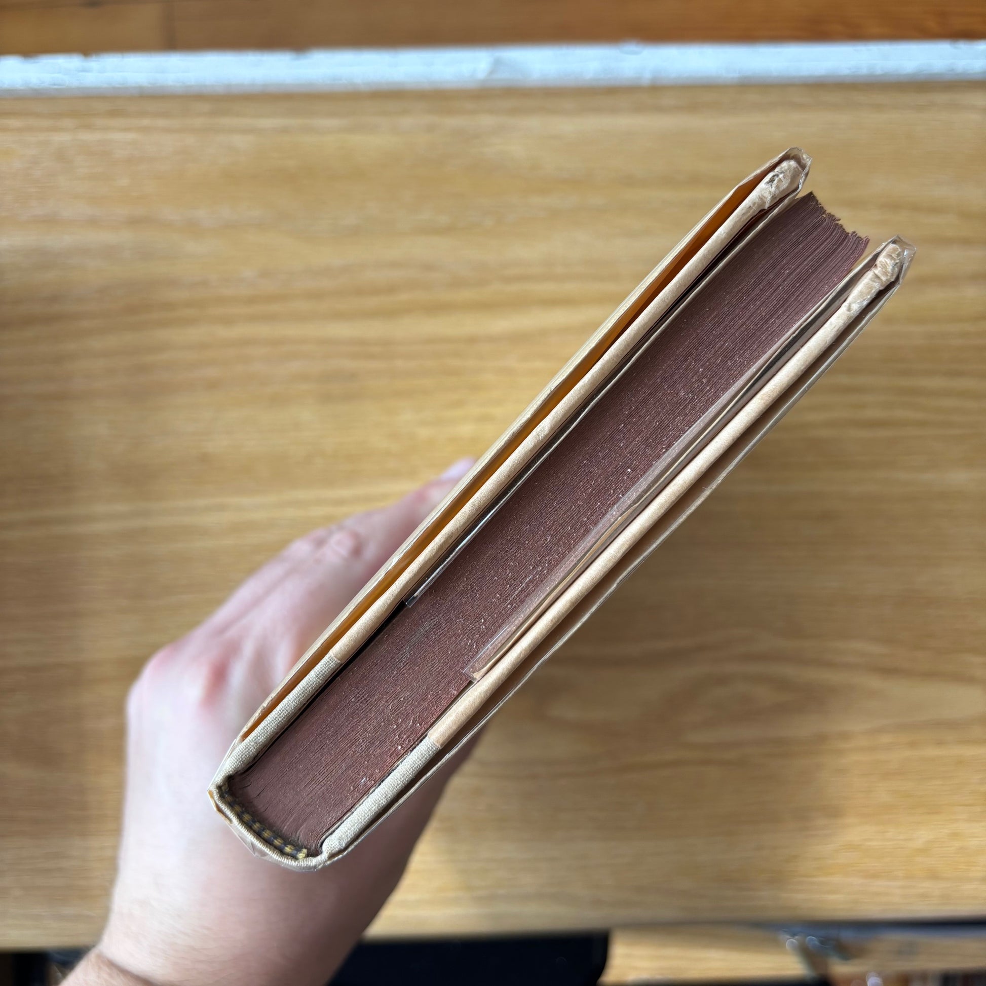 Some small tears and loss at corners, more noticeable loss at head of spine with a few small pieces missing. Stain in middle of front panel which isn't as noticeable as it could be, given the tan and brown colors of the dust jacket. Light soiling to rear panel, spine slightly darkened. Now housed in Brodart cover. Top board corners heavily bumped, slight dulling to top stain, scattered light foxing at other page edges. Sticker ghost on front endpaper. Binding sound, interior clean. Overall VG in a G+/VG- jacket.